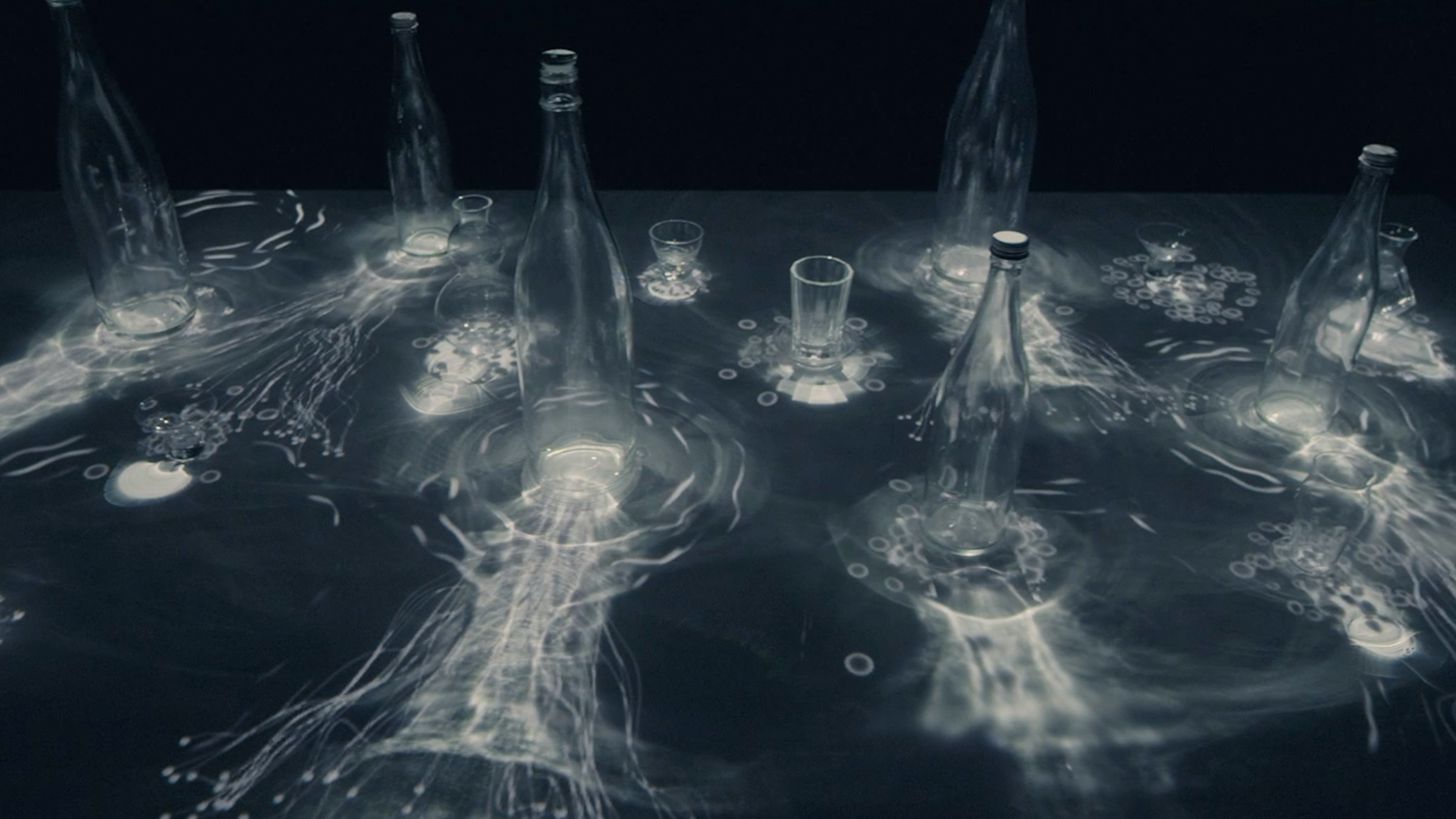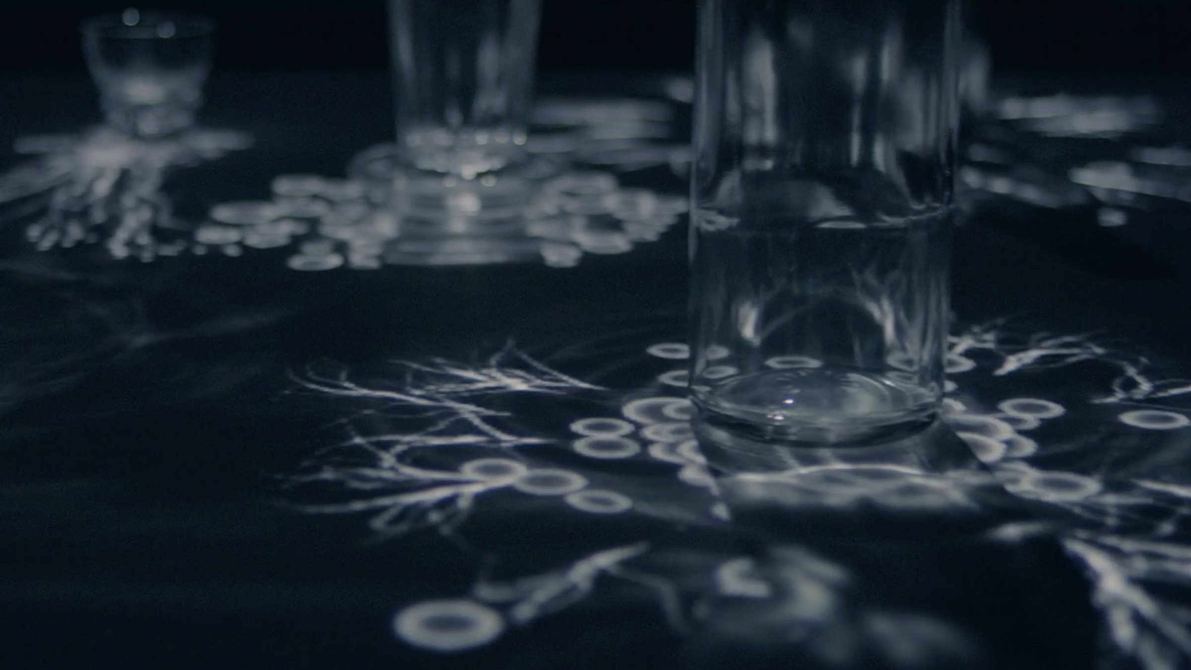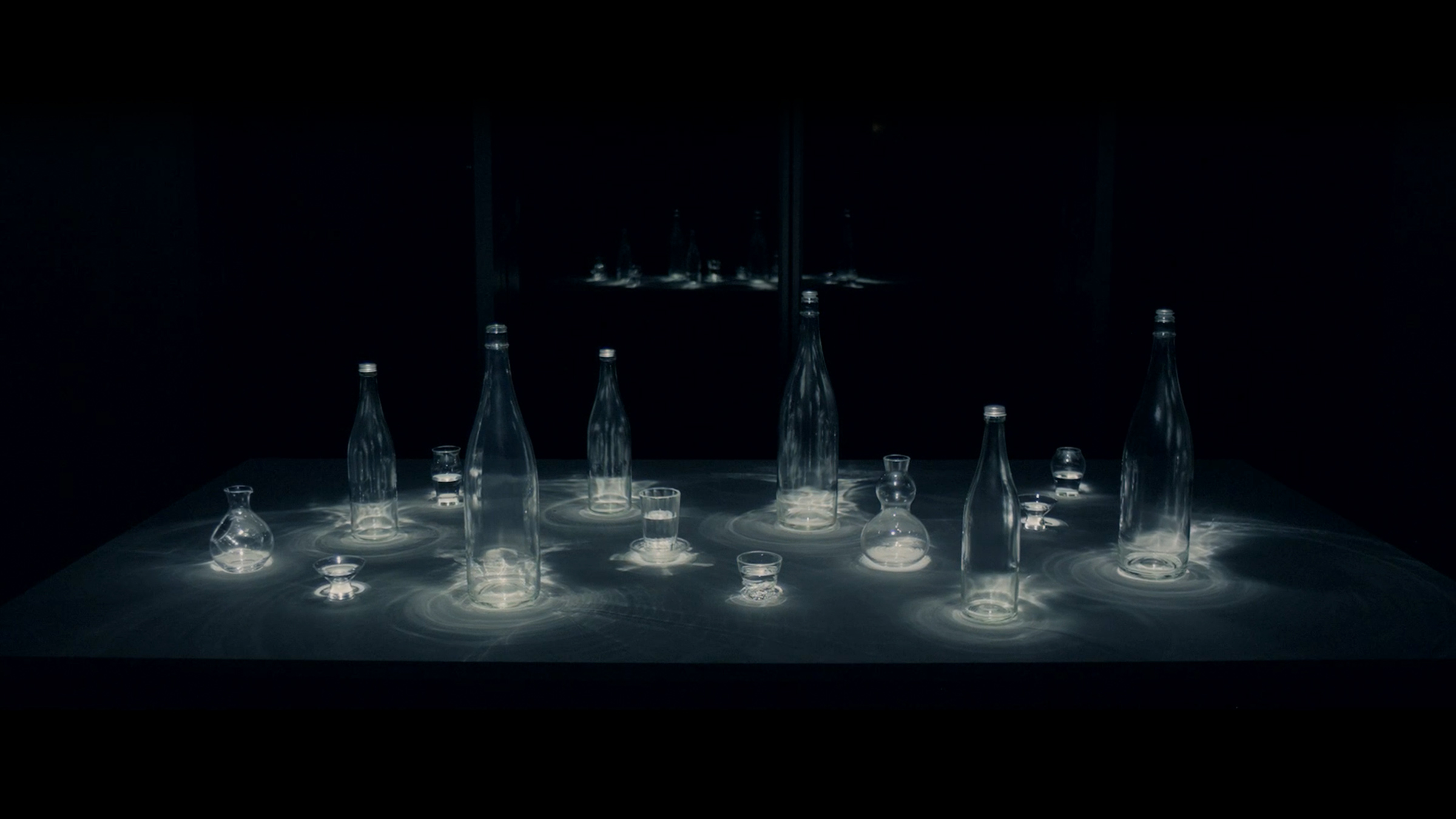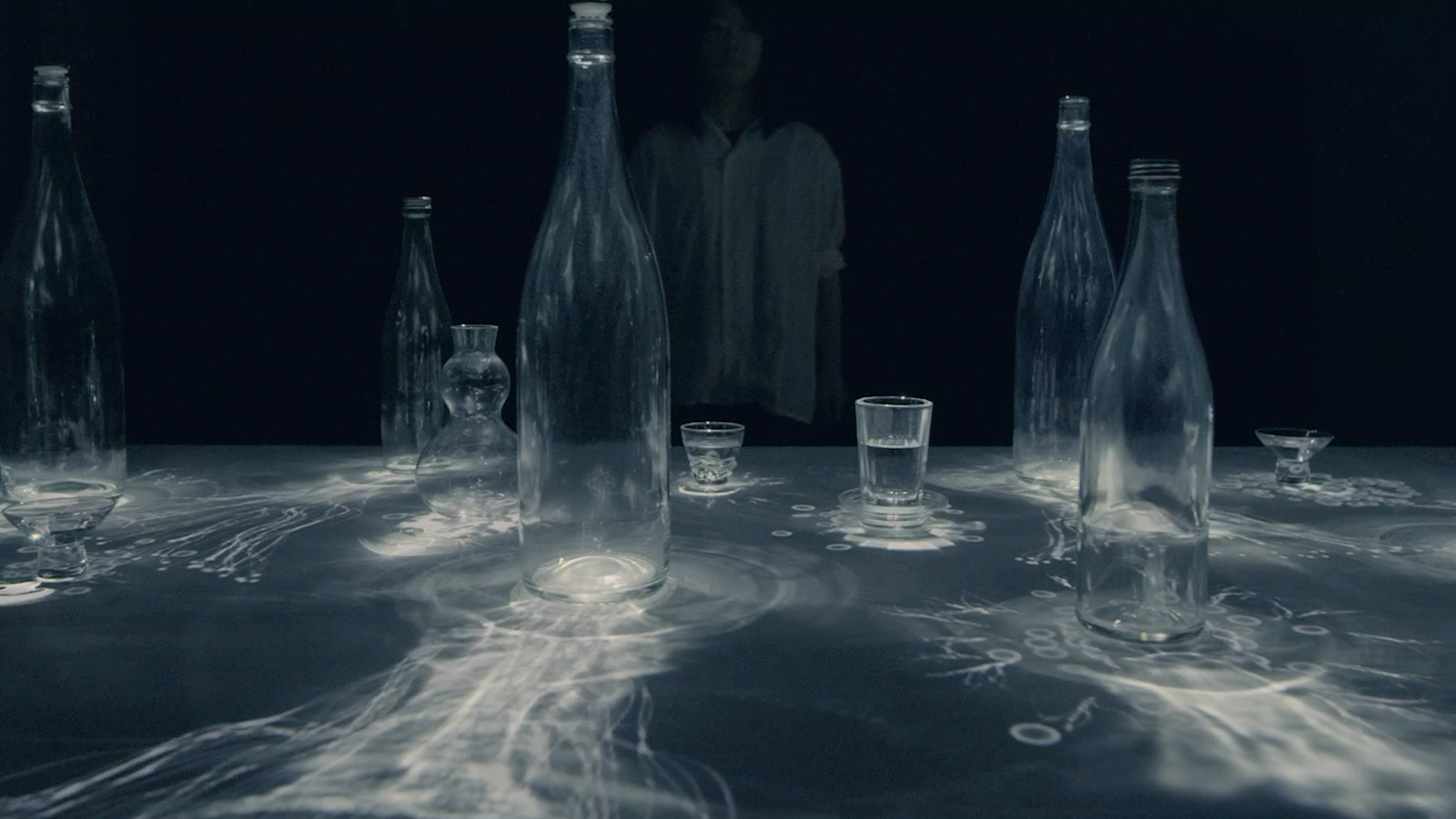 本作は、鑑賞者とのインタラクションによって、展示された酒器から伸びる影が変化するインスタレーション作品。鑑賞者は影の変化を完全に目視することはできず、気配を通して存在を感じる体験になっている。