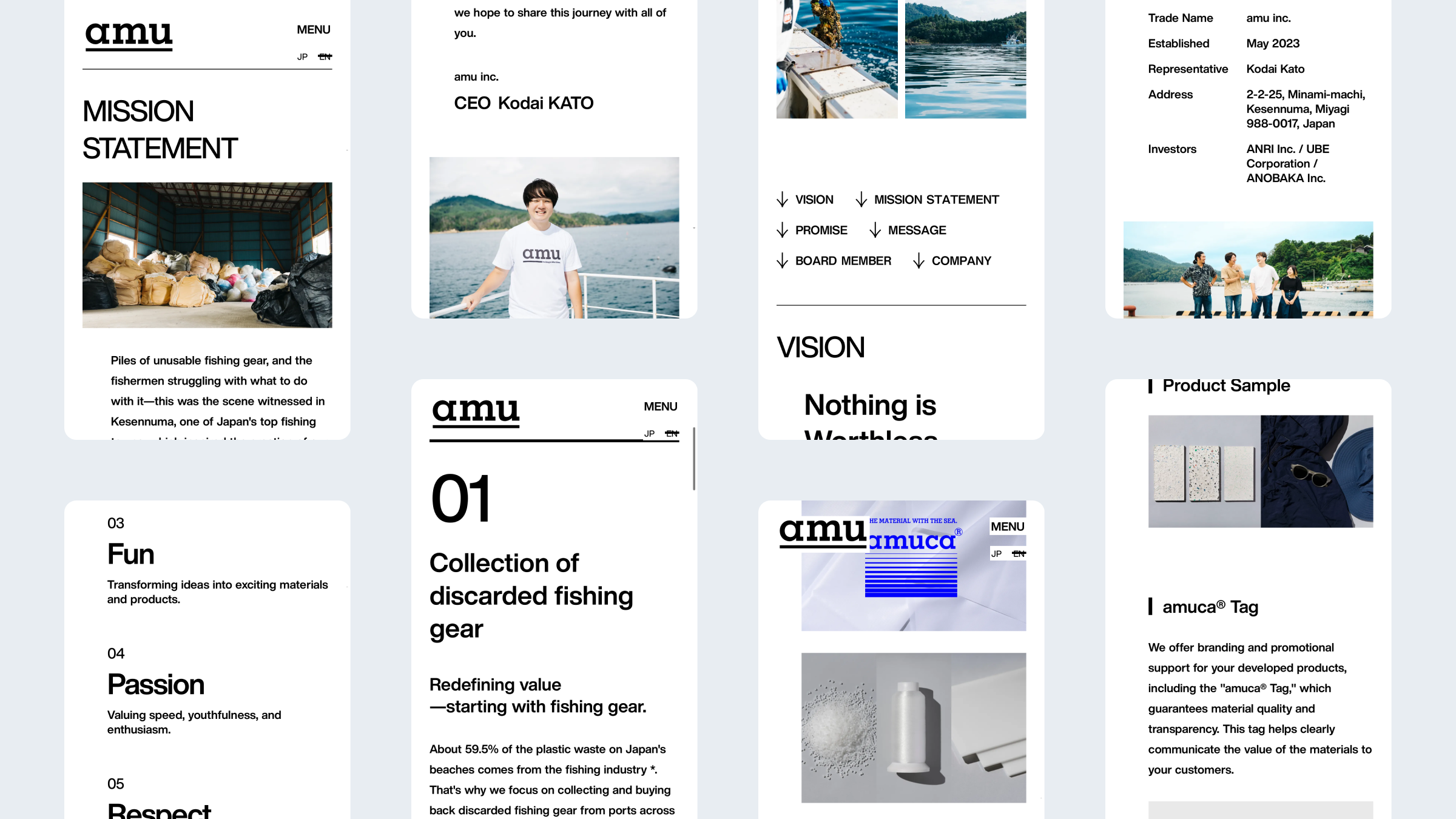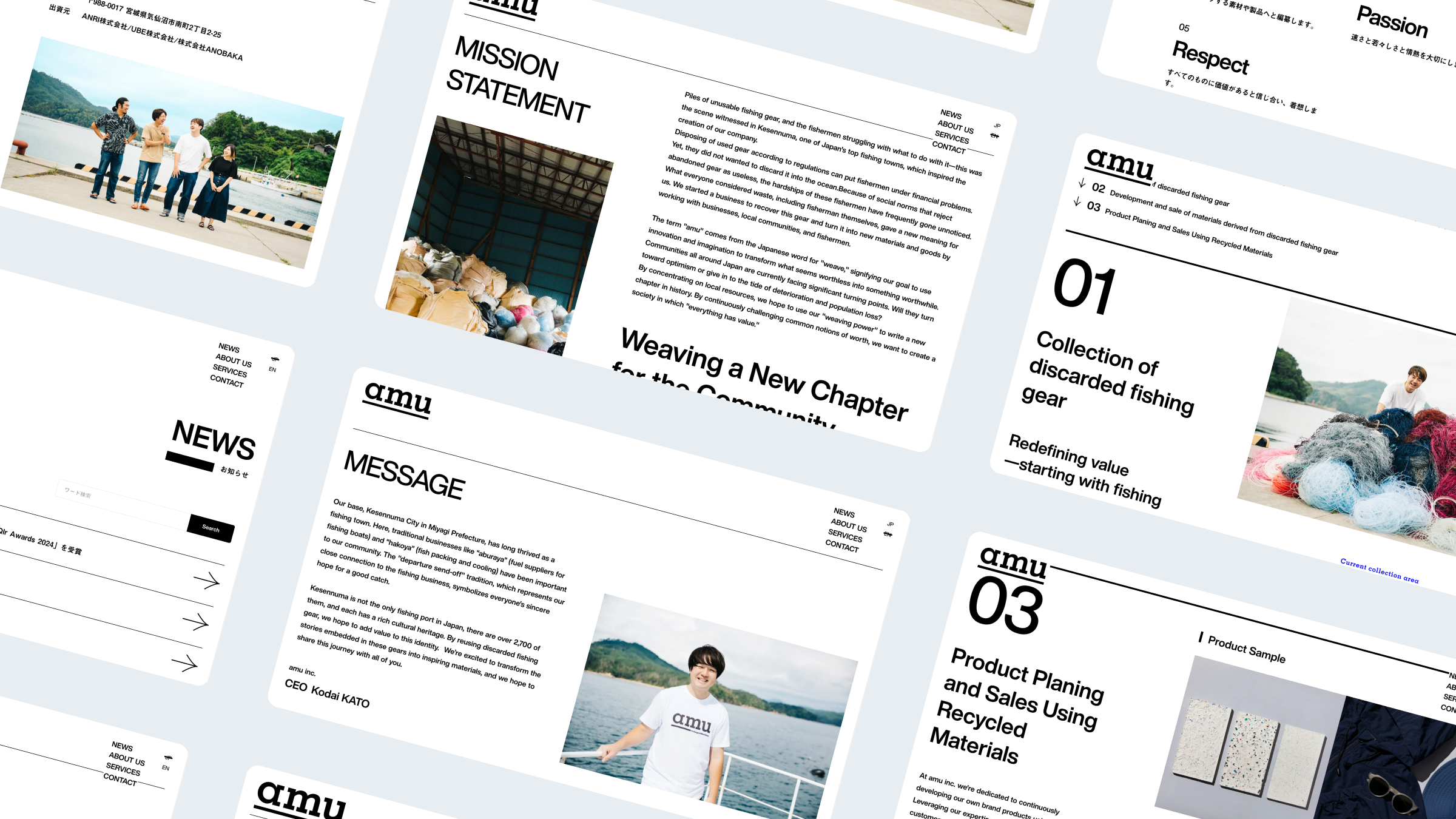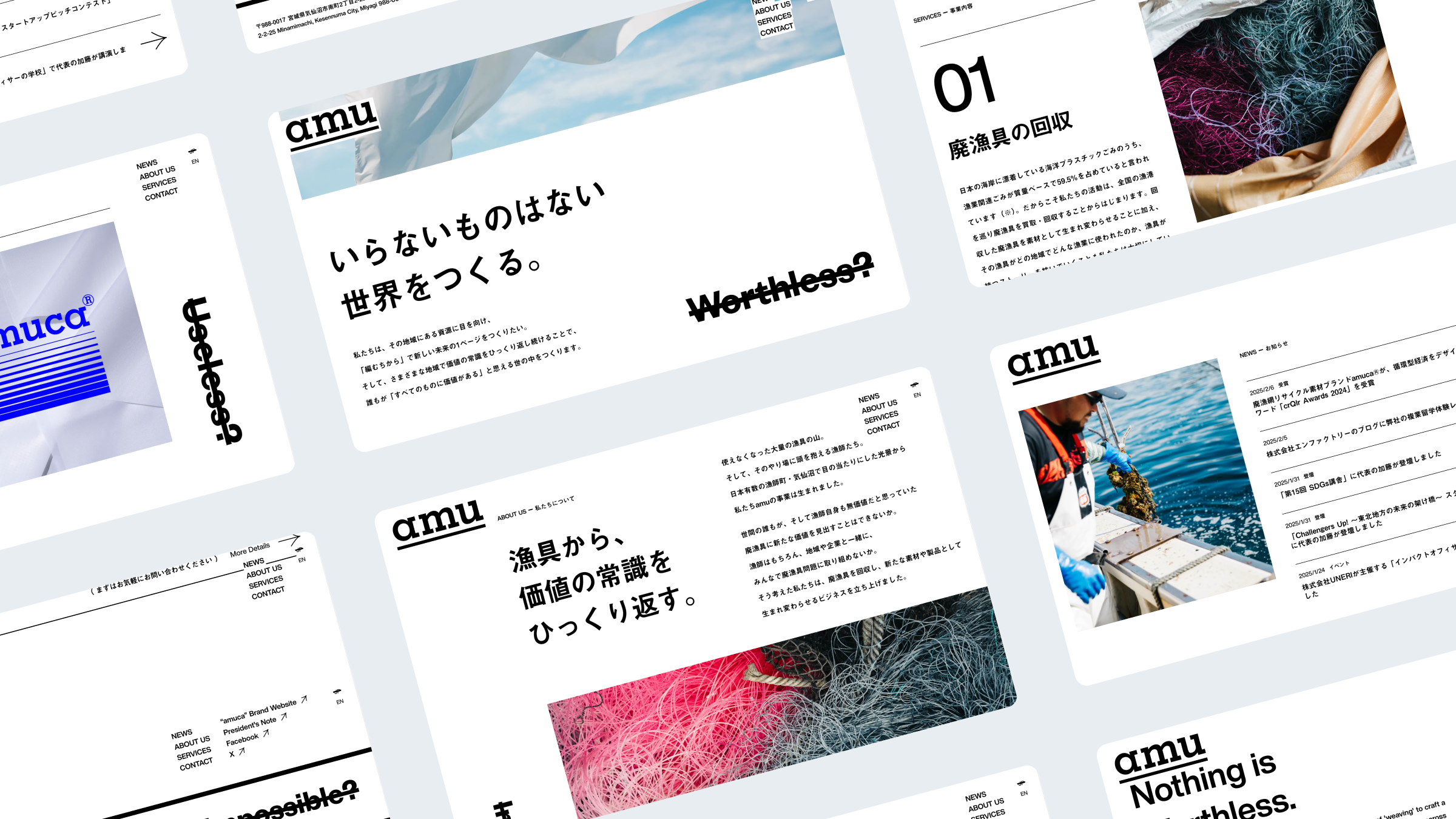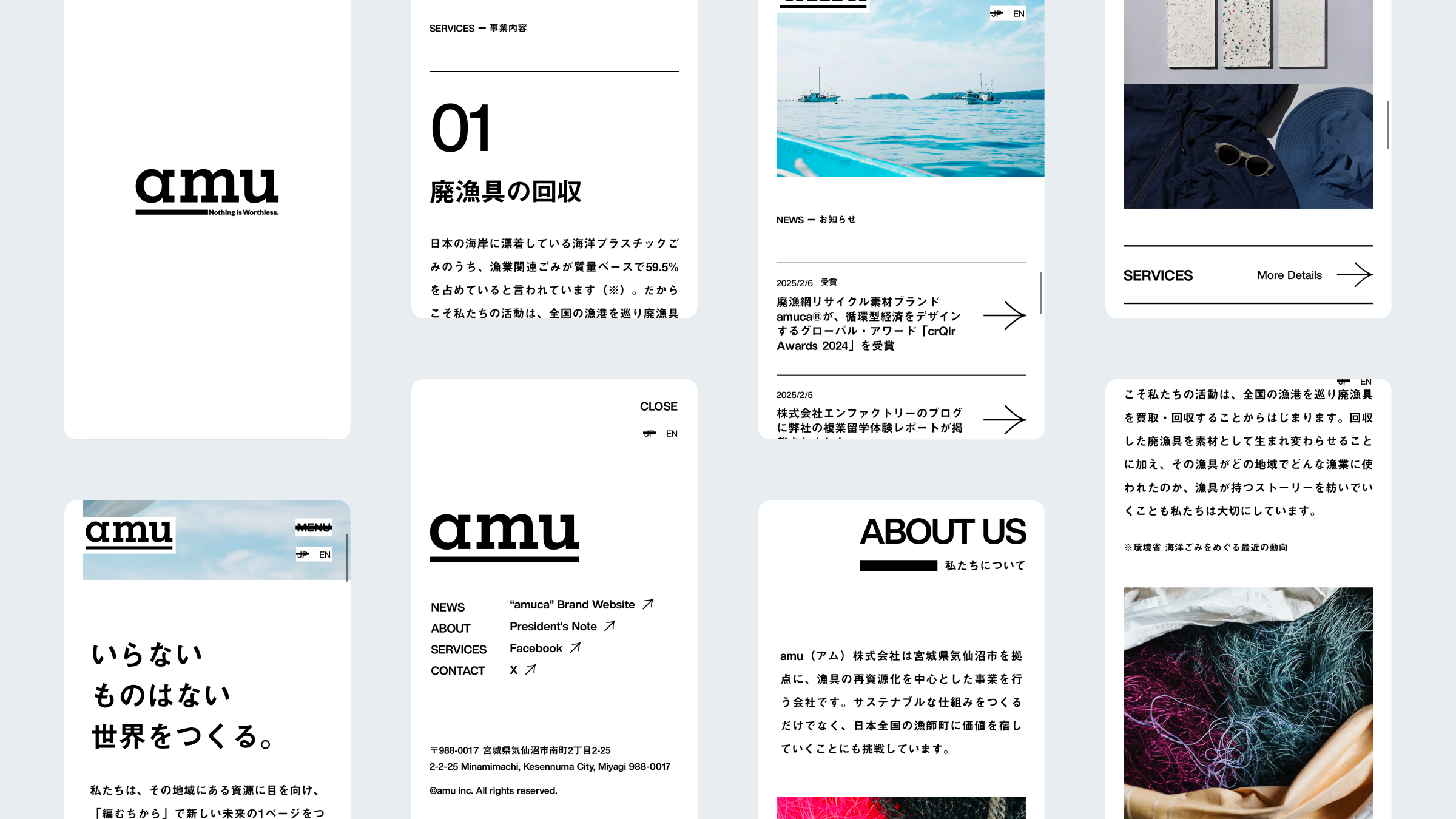 宮城県気仙沼市を拠点に、漁具の再資源化を中心とした事業を行う会社「amu」のコーポレートサイト。ロゴのリニューアルのタイミングで、サイトデザインも合わせてリニューアルを行なった。STUDIOによる制作のため、デザインから実装・公開までを担った。
