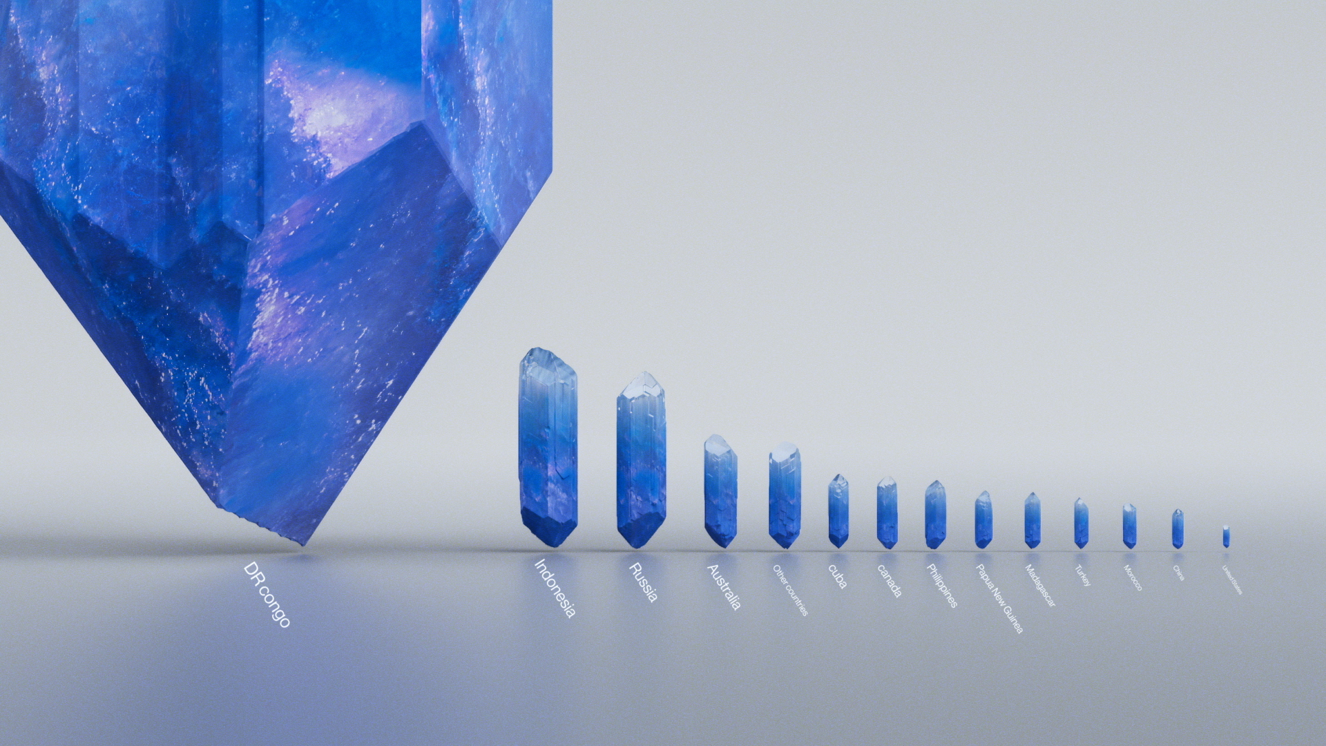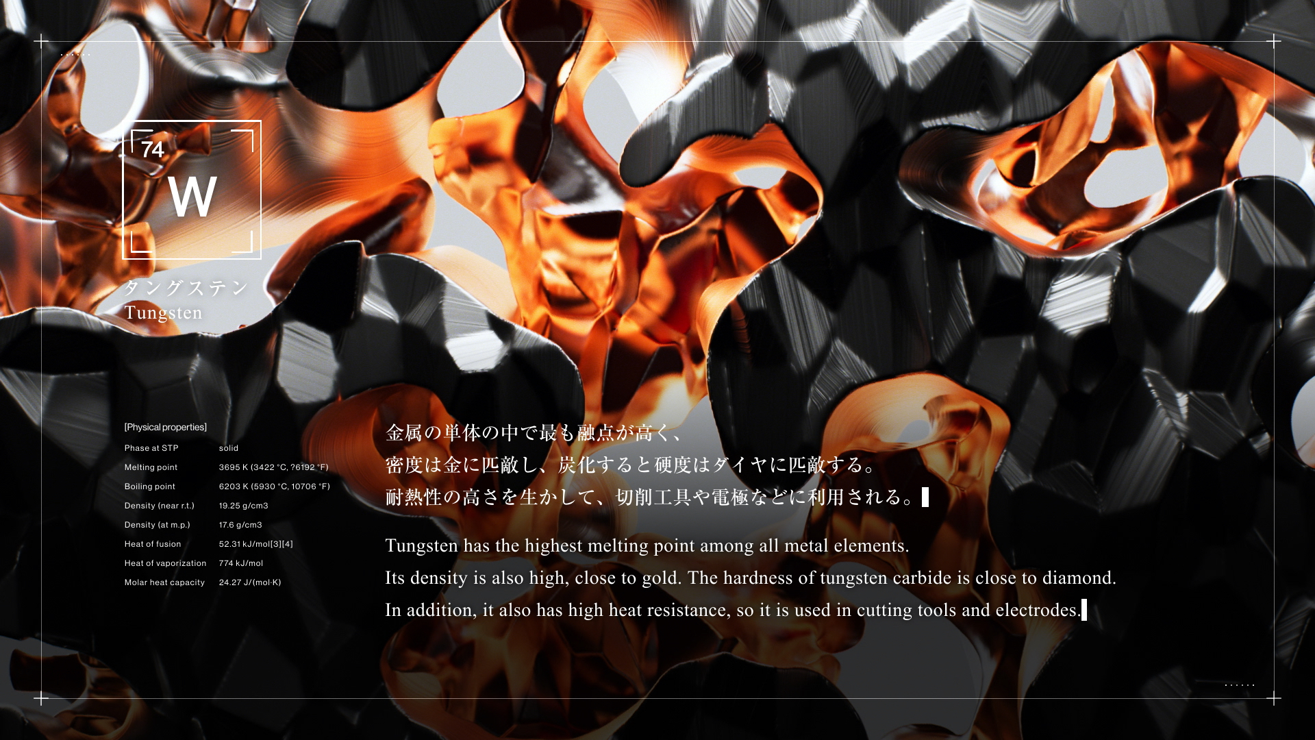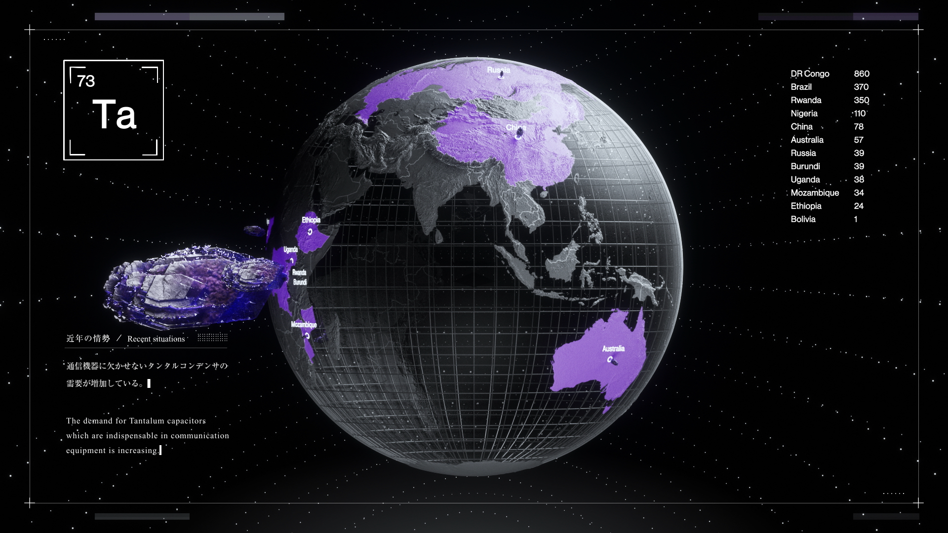 データの背後にある文脈や物質性を「質感」として再起させるデザインアプローチ“InfoTexture”を提案。その第1弾のスタディとして、レアメタルの生産量に焦点を当てた映像を制作した。レアメタルの鉱物としてのビジュアルの美しさとともに、産出国の偏りという課題を考えるための視覚化を試みた。