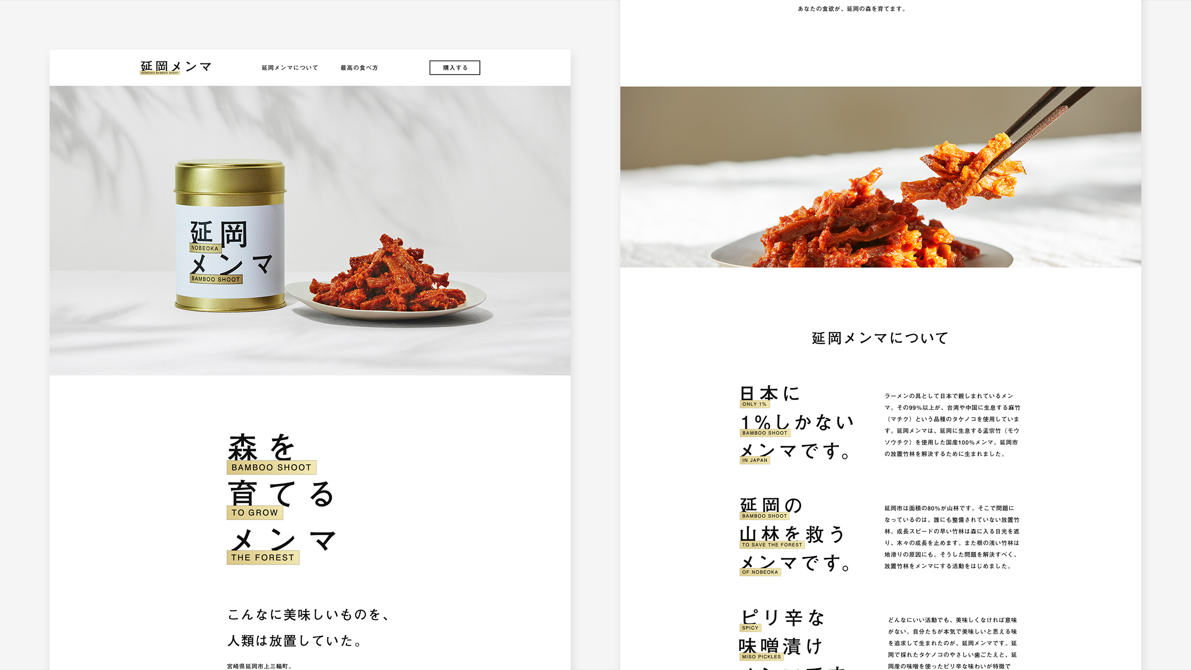 増加傾向にある放置竹林がもたらす様々な被害を食い止めるために生み出された、延岡に生息する孟宗竹を使用した国産100%「延岡メンマ」が発売。ブランドサイトの制作を担当した。